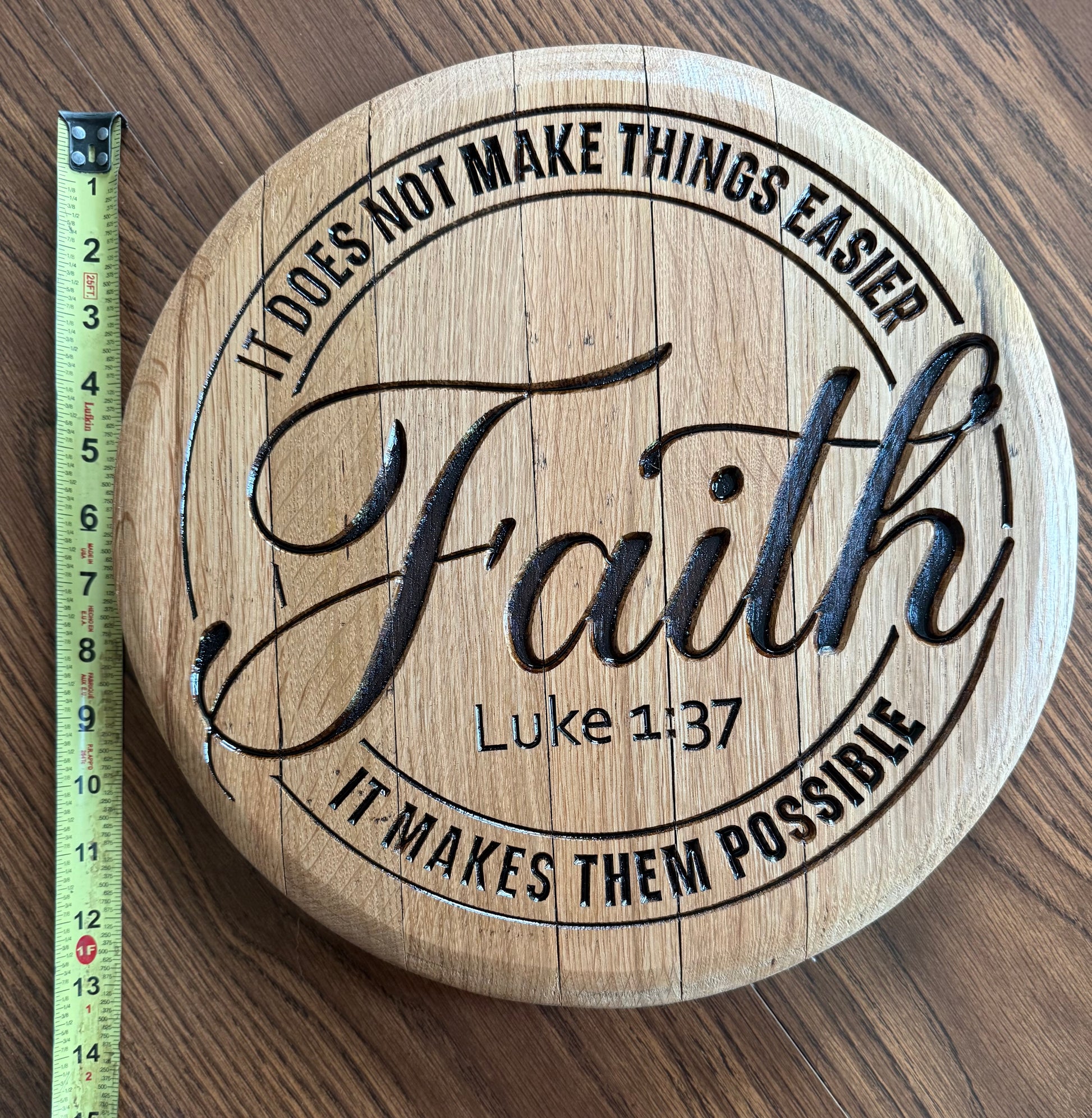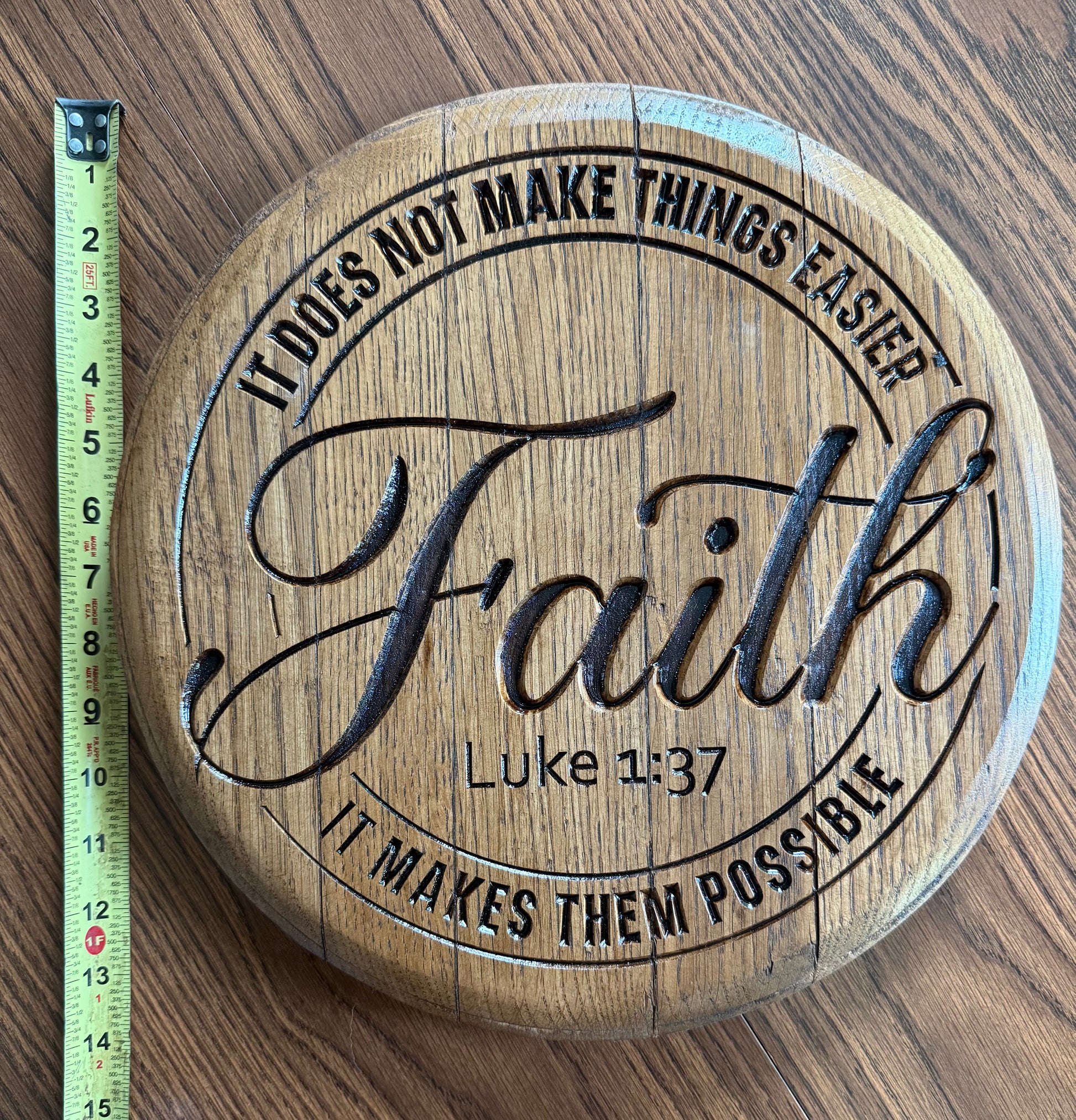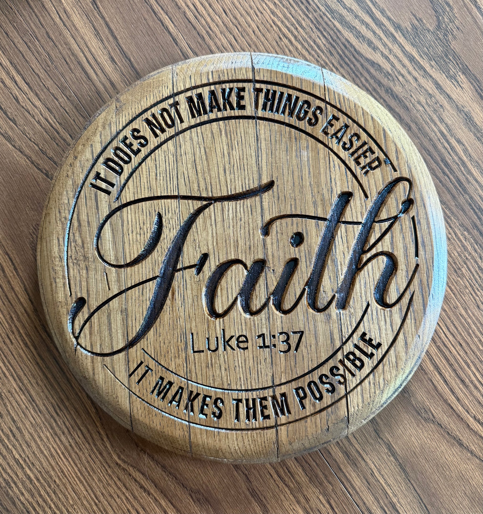 The artwork is engraved with a CNC on authentic 15-gallon oak bourbon barrel heads.