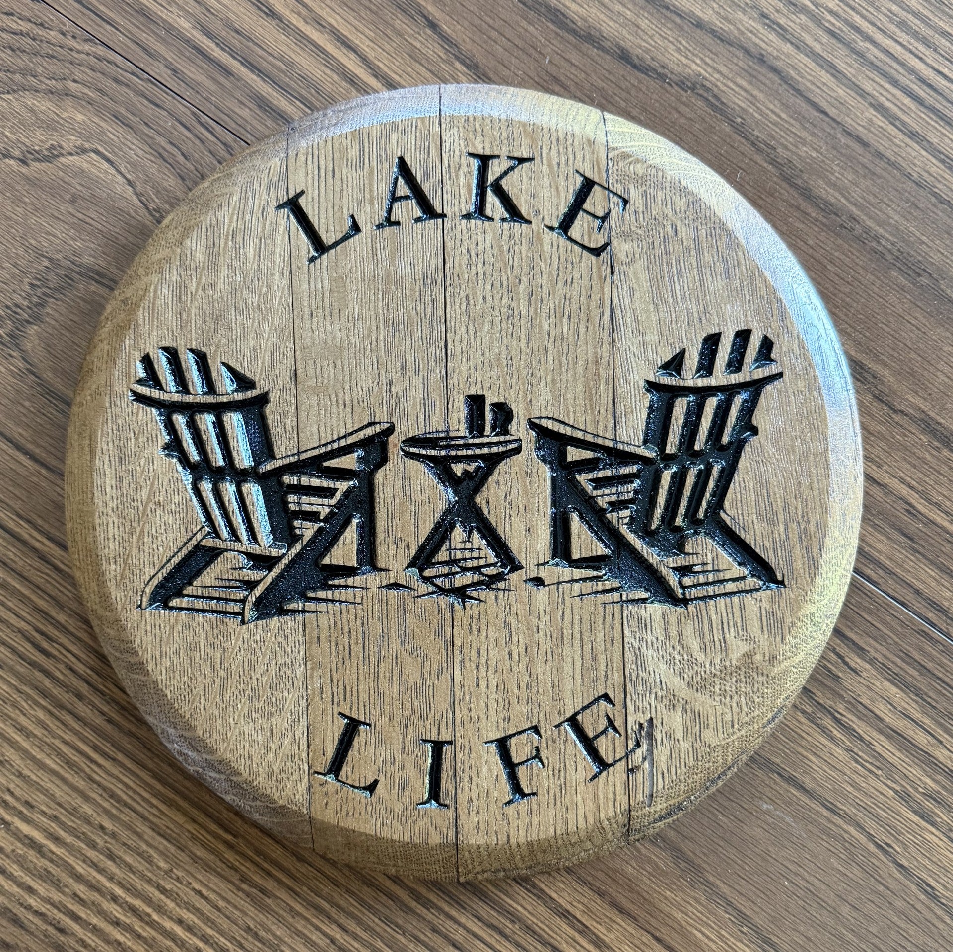 The artwork is engraved with a CNC on authentic 10" oak bourbon barrel heads.